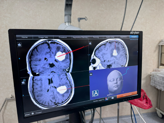 Tümör cerrahisinde temel felsefemiz şudur: "Maksimum tümör çıkarımı, minimum doku hasarı." Bunu sağlamanın en güvenli yolu ise mikrocerrahidir. Mikroskop altında yapılan ameliyatlarda, normal beyin dokusu ile tümör dokusu arasındaki sınırları net bir şekilde ayrıştırarak, hastalarımızın ameliyat sonrası yaşam kalitesini en üst düzeyde tutmayı hedefliyoruz. şekil 1: İntraoperatif navigasyon ile tümör yeri belerlenip çok küçük bir kesi ile tümörü tamamen çıkarmak mümkün olmaktadır.