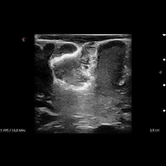 Donanım olarak nöronavigasyon (Şekil-1), Şekil 2a: İntraoperatif ultrason ile beyin tümörün görüntüsü.